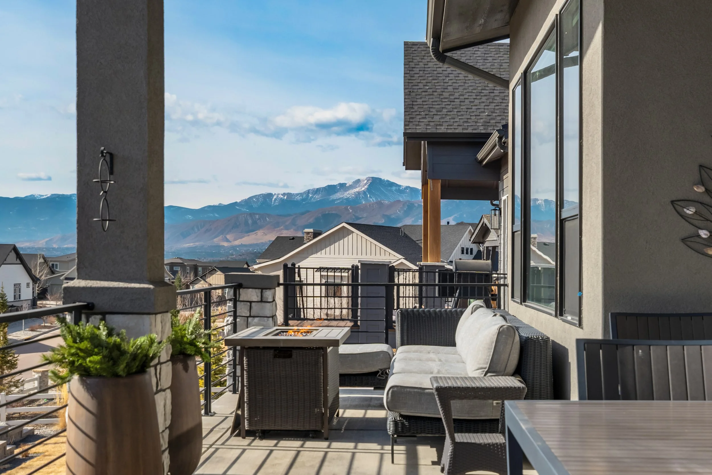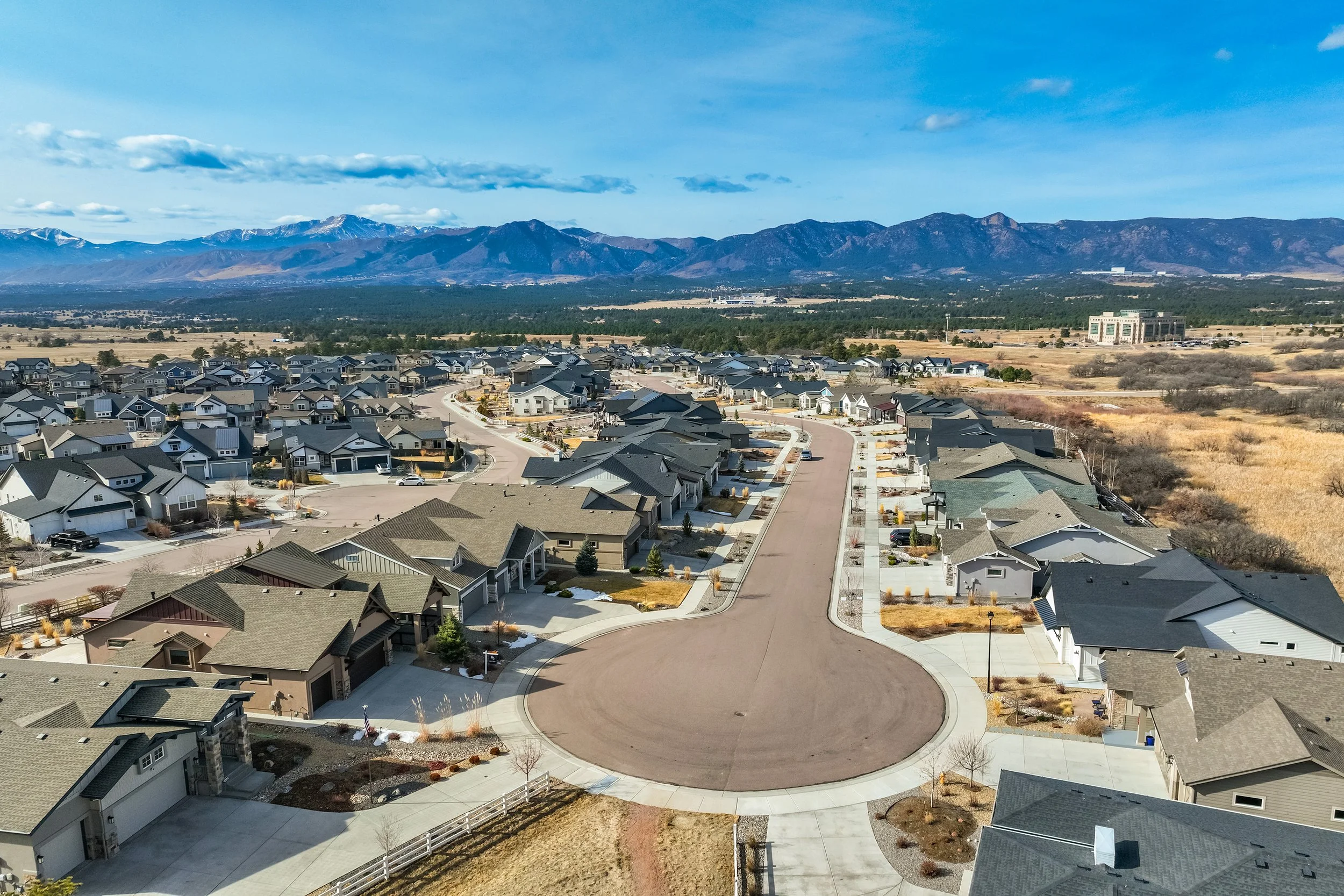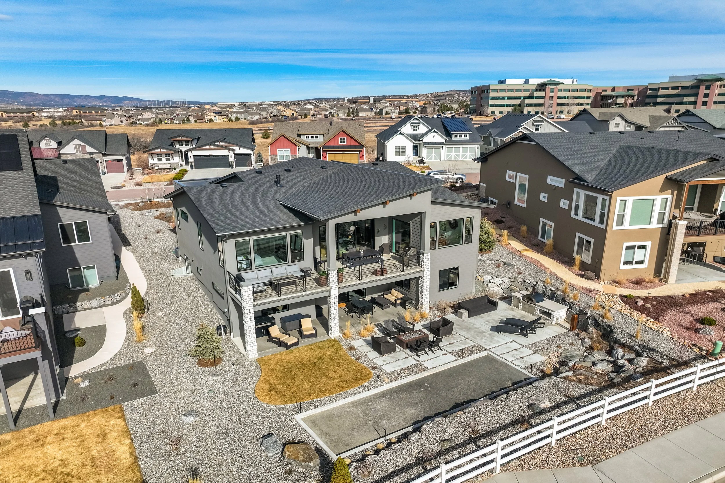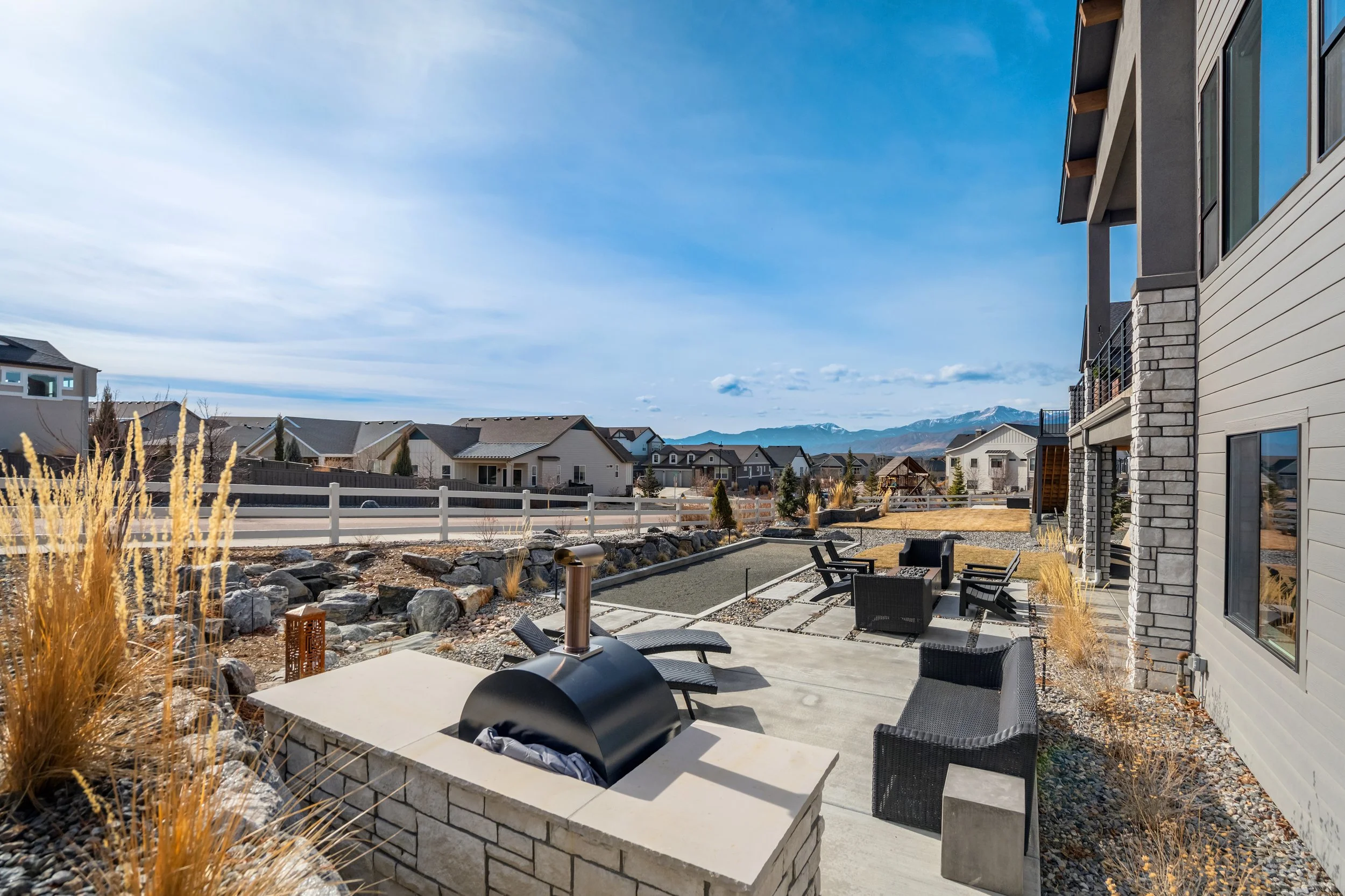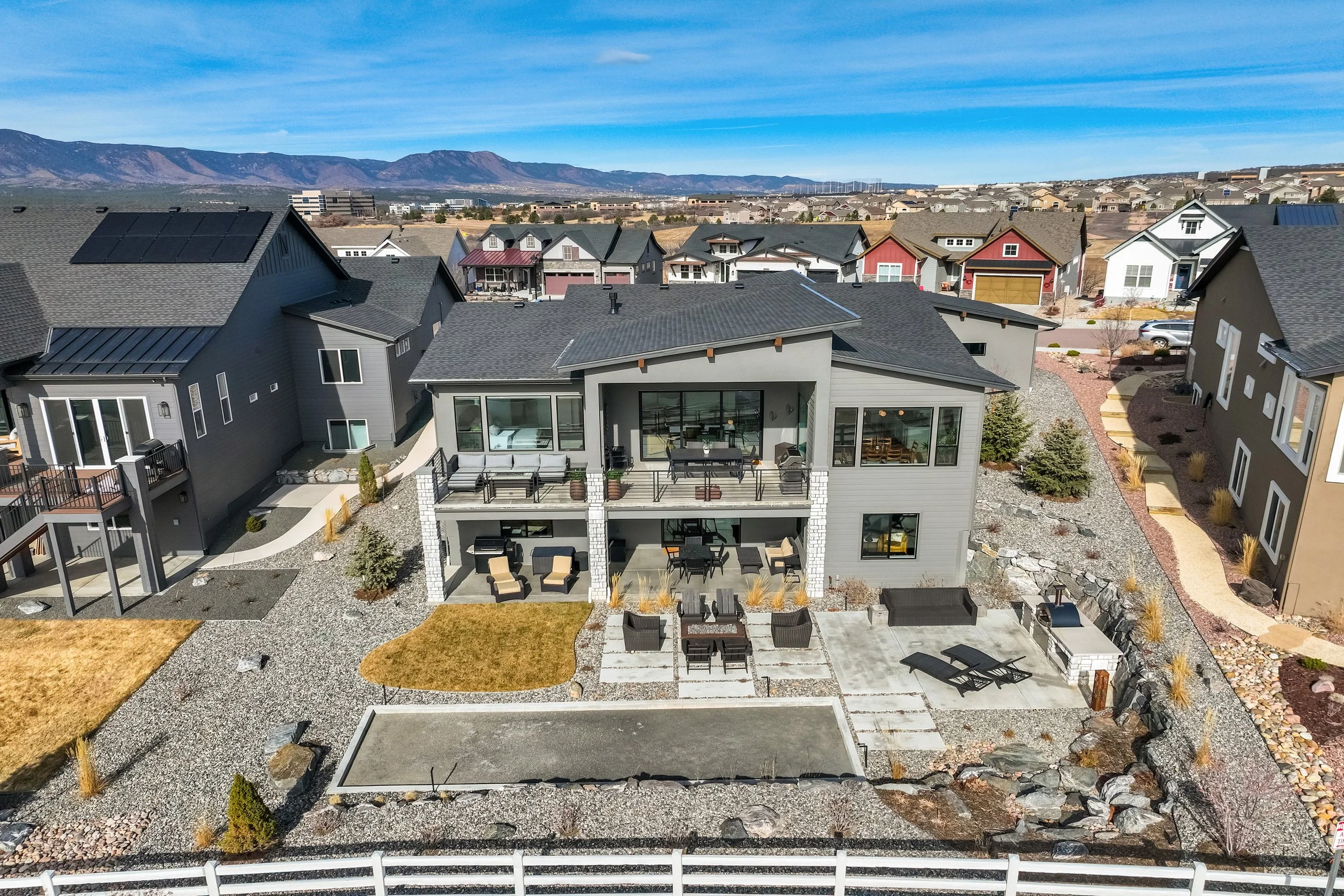 Commanding a .29-acre executive lot, this customized ranch floorplan by Saddletree Homes captures panoramic Pikes Peak and Front Range views—an architectural statement set against Colorado’s iconic backdrop. Soaring 10–13’ ceilings, 8’ doors, alder beams, electronic blinds + hardwood floors on the main, upgraded windows, lightly hand-troweled walls + dimmable lighting establish craftsmanship throughout. A floor-to-ceiling stone fireplace anchors the great room, while a dramatic Western Wall stacked slider creates seamless transition to outdoor living framed by mountain horizon. The kitchen balances design + performance w/10’ quartzite island, honed quartzite countertops, two-toned soft-close cabinetry, stainless steel appliances including gas range w/pot filler, under-cabinet lighting + walk-in pantry. A 2nd main-lvl bedroom + bath offer guest/multi-gen flexibility. The owner’s suite features integrated speakers, heated tile floors, mud-set shower w/linear drain, dual heads + quartz bench, quartz vanities w/counter-to-ceiling backsplash, freestanding tub + expansive walk-in closet opening directly to laundry rm. The walk-out bsmt is designed for entertaining w/9’ ceilings, surround sound, wet bar w/substantial granite edge, beverage refrigerator, ice maker, temperature-controlled wine cellar, Jr Suite w/walk-in closet + private bath, dedicated office w/French doors + modern fireplace, 4th bed/bath + unfinished storage. Outdoor living rivals w/bocce court, built-in kitchen w/dual-fuel pizza oven, black granite water feature, modern pavers w/gas fire pit, expansive concrete covered deck + sun deck w/speakers + gas line. Oversized finished 3-car garage pre-wired for EV charger. Located in the sought-after Farm community w/District 20 schools, The Gathering Place Rec Center, trails + open space + convenient access to shopping, dining + I-25. Constructed for high-performance efficiency, this residence delivers elevated design + lifestyle distinction without compromise.
