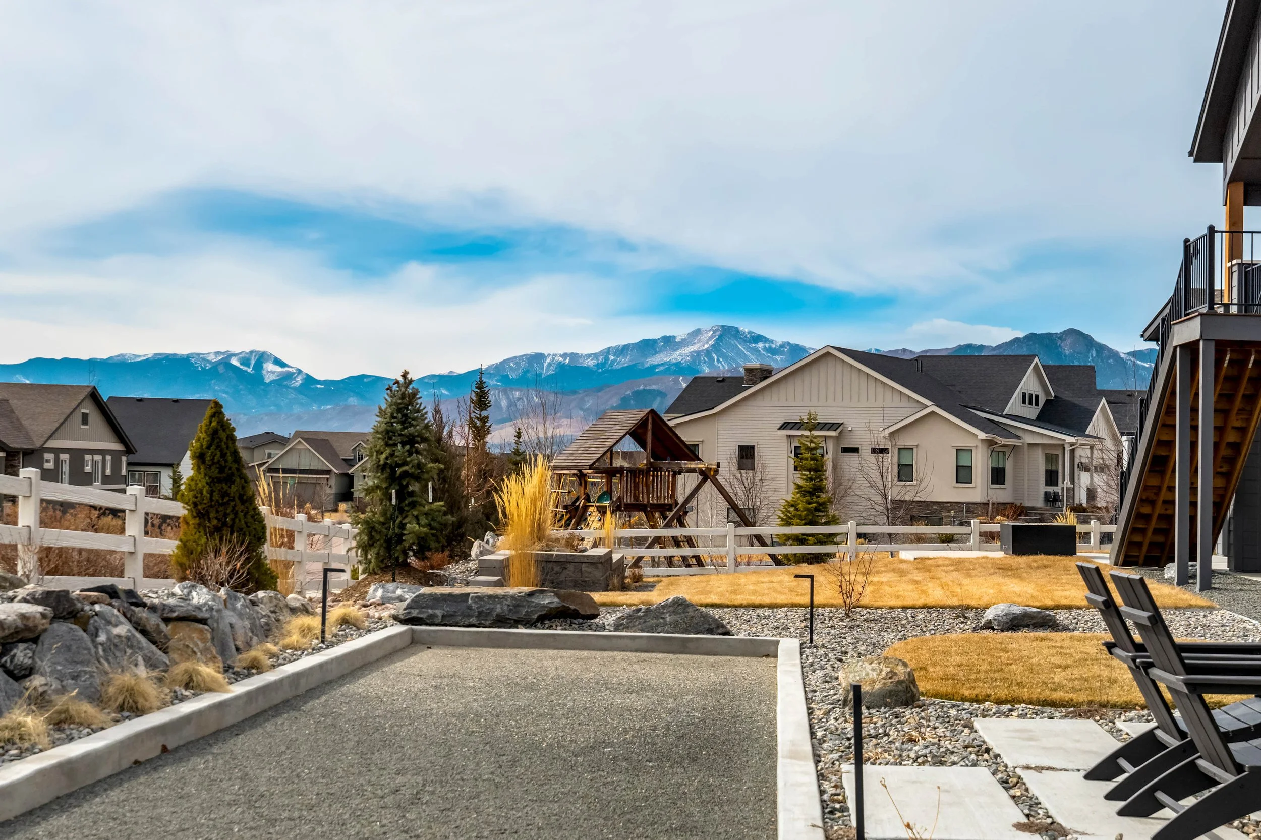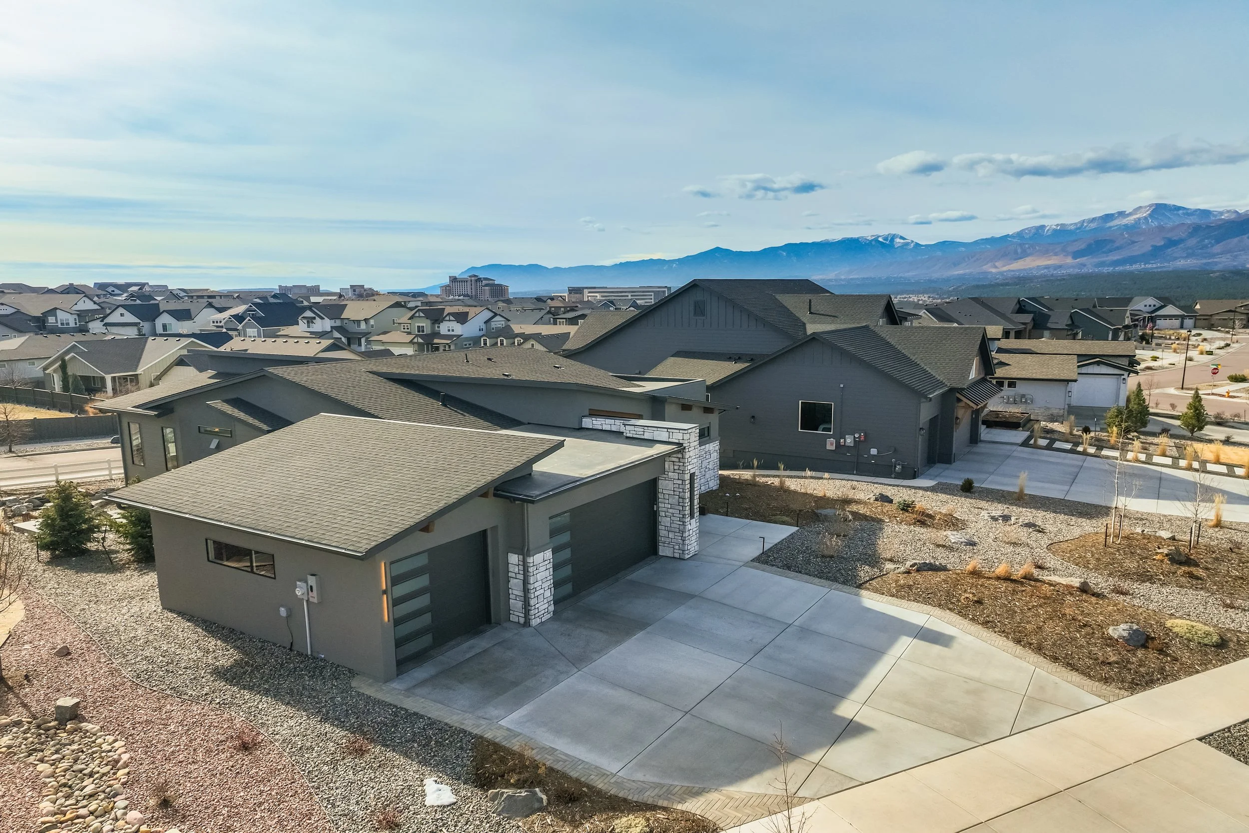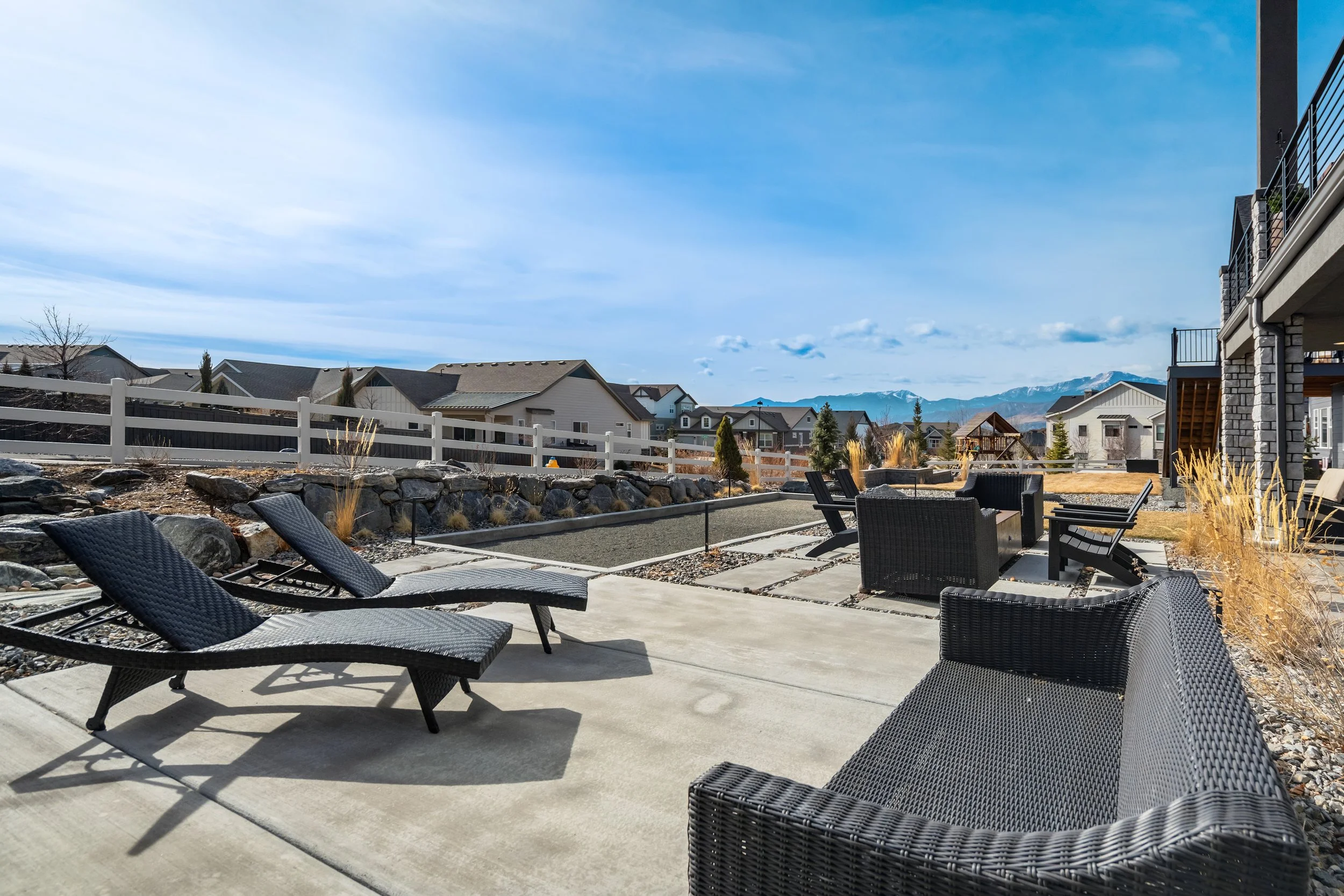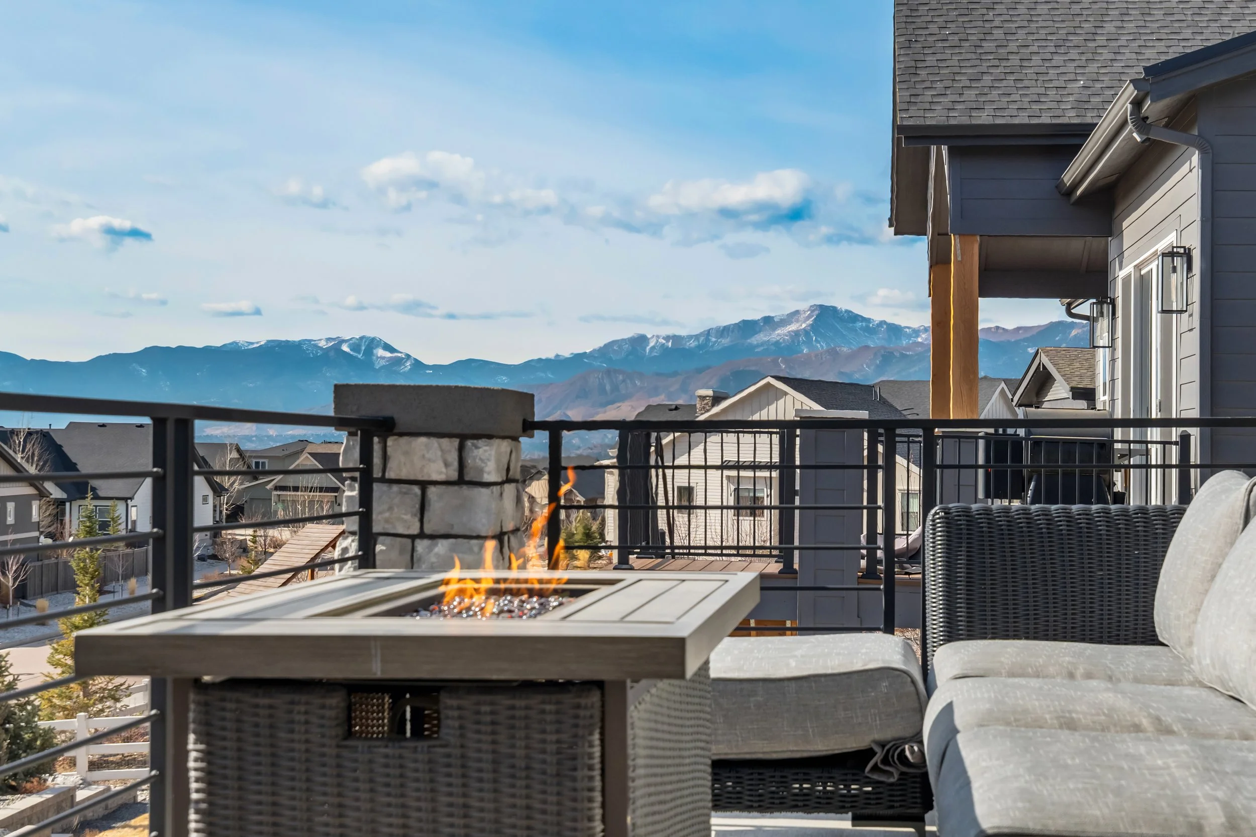 Commanding a .29-acre executive lot, this customized ranch floorplan by Saddletree Homes captures panoramic Pikes Peak and Front Range views—an architectural statement set against Colorado’s iconic backdrop. Soaring 10–13’ ceilings, 8’ doors, alder beams, electronic blinds + hardwood floors on the main, upgraded windows, lightly hand-troweled walls + dimmable lighting establish craftsmanship throughout. A floor-to-ceiling stone fireplace anchors the great room, while a dramatic Western Wall stacked slider creates seamless transition to outdoor living framed by mountain horizon. The kitchen balances design + performance w/10’ quartzite island, honed quartzite countertops, two-toned soft-close cabinetry, stainless steel appliances including gas range w/pot filler, under-cabinet lighting + walk-in pantry. A 2nd main-lvl bedroom + bath offer guest/multi-gen flexibility. The owner’s suite features integrated speakers, heated tile floors, mud-set shower w/linear drain, dual heads + quartz bench, quartz vanities w/counter-to-ceiling backsplash, freestanding tub + expansive walk-in closet opening directly to laundry rm. The walk-out bsmt is designed for entertaining w/9’ ceilings, surround sound, wet bar w/substantial granite edge, beverage refrigerator, ice maker, temperature-controlled wine cellar, Jr Suite w/walk-in closet + private bath, dedicated office w/French doors + modern fireplace, 4th bed/bath + unfinished storage. Outdoor living rivals w/bocce court, built-in kitchen w/dual-fuel pizza oven, black granite water feature, modern pavers w/gas fire pit, expansive concrete covered deck + sun deck w/speakers + gas line. Oversized finished 3-car garage pre-wired for EV charger. Located in the sought-after Farm community w/District 20 schools, The Gathering Place Rec Center, trails + open space + convenient access to shopping, dining + I-25. Constructed for high-performance efficiency, this residence delivers elevated design + lifestyle distinction without compromise.
