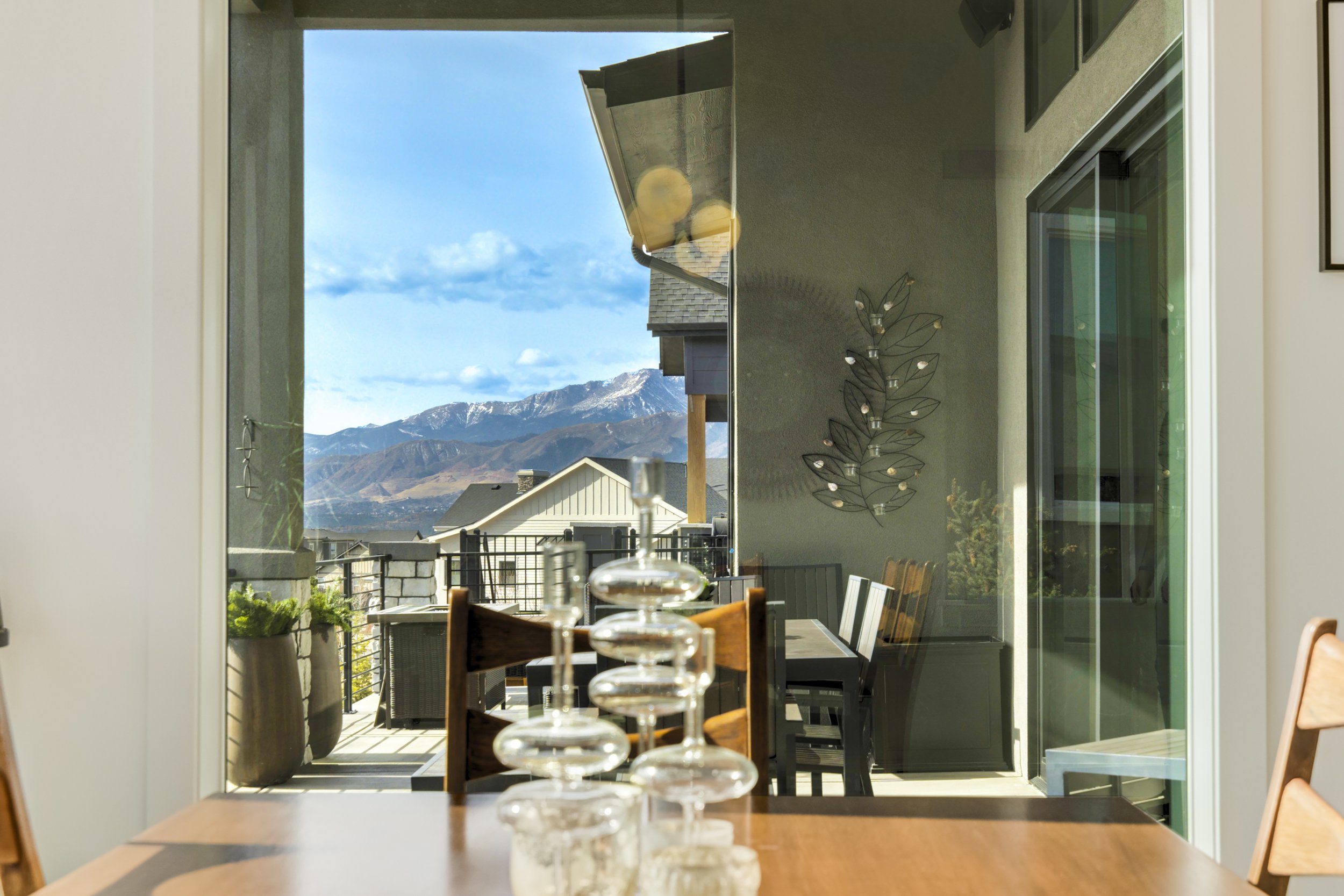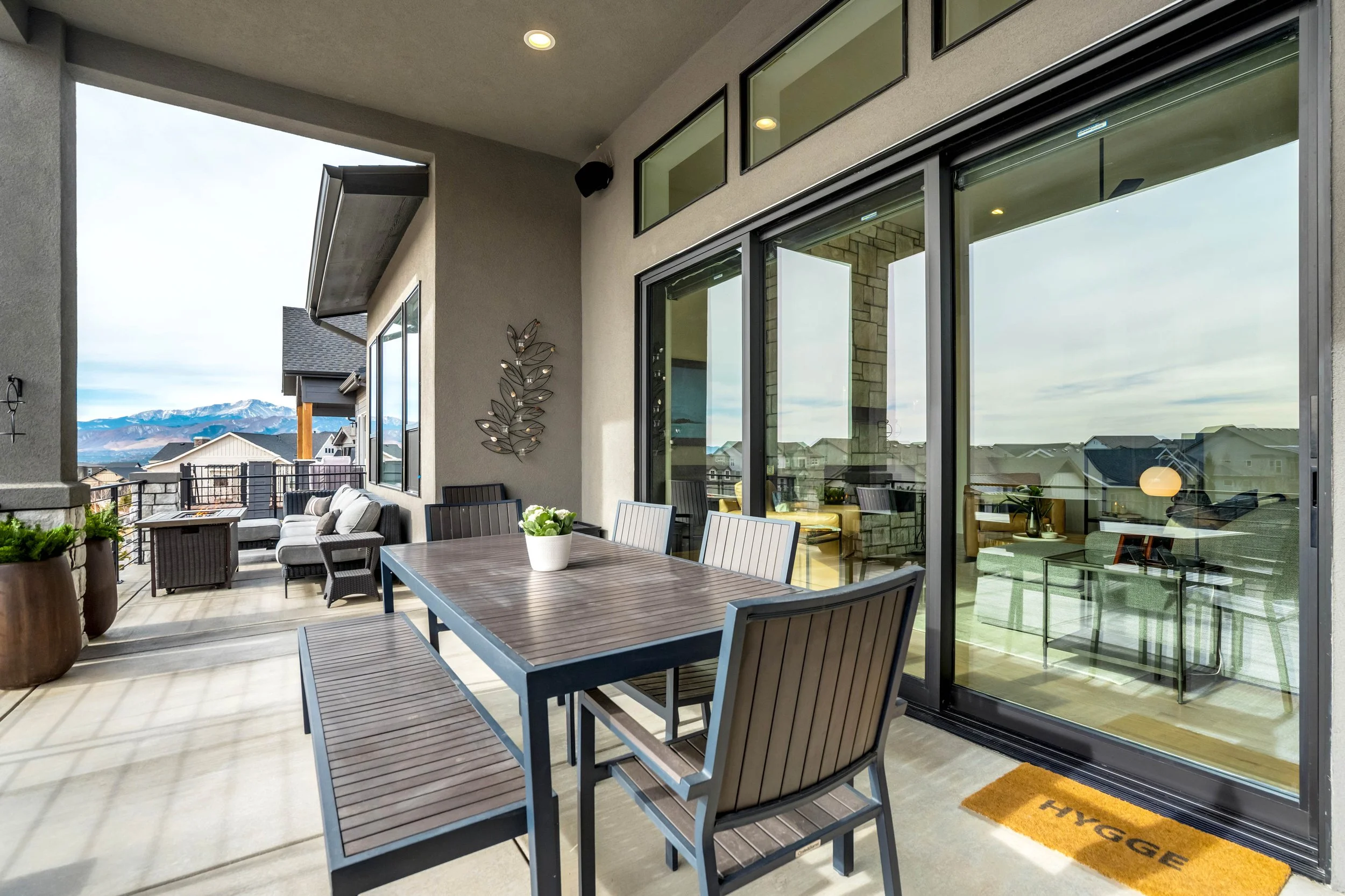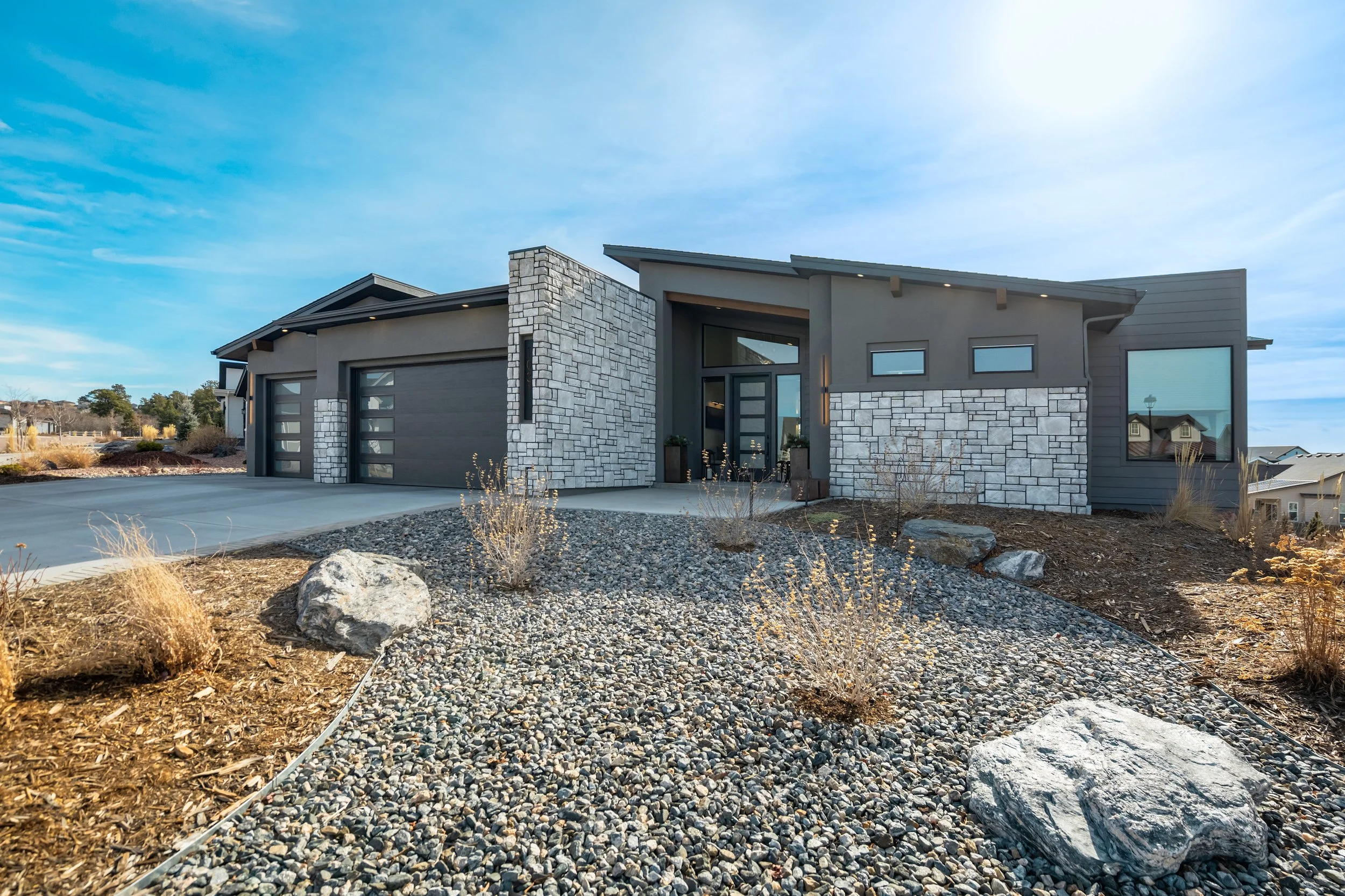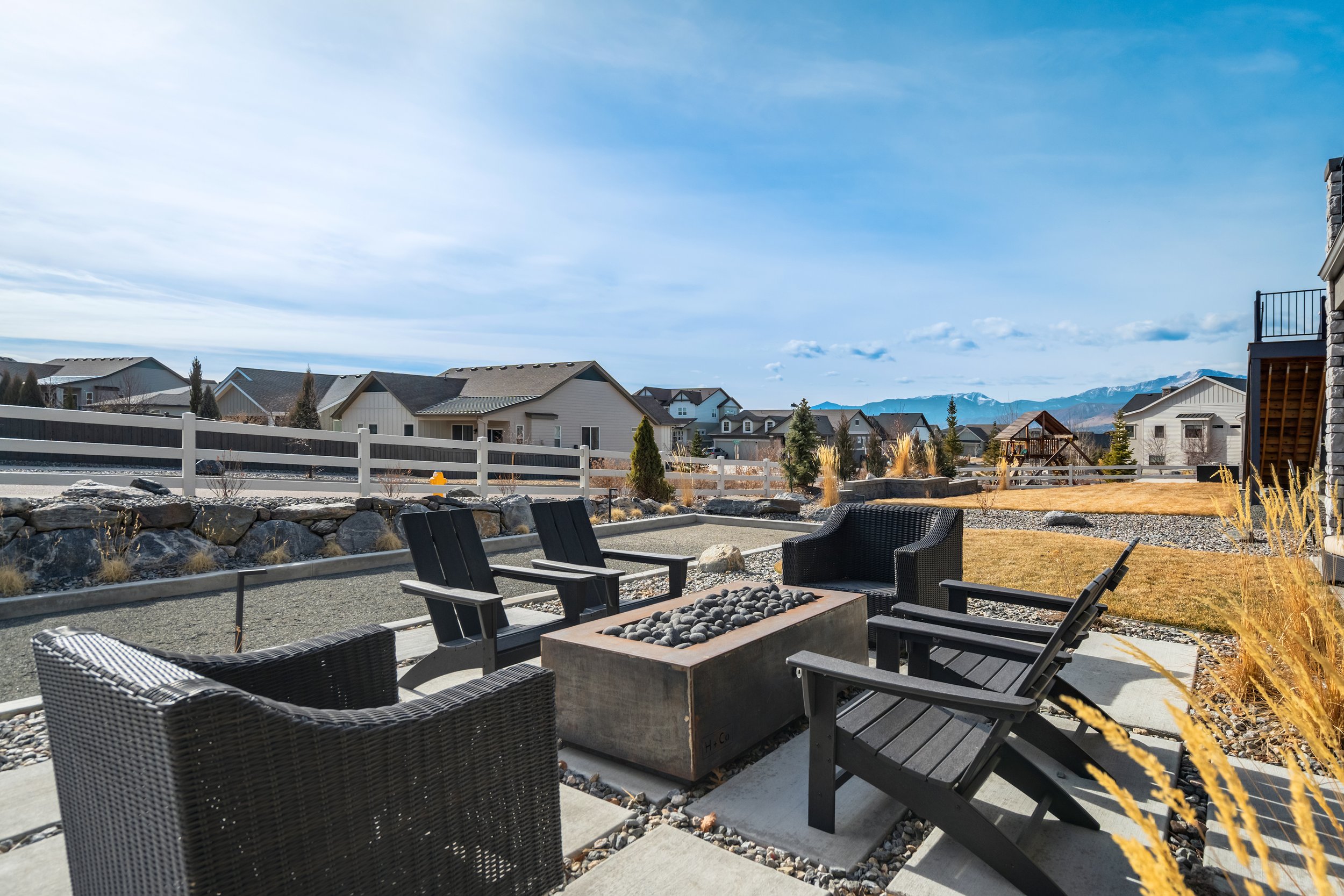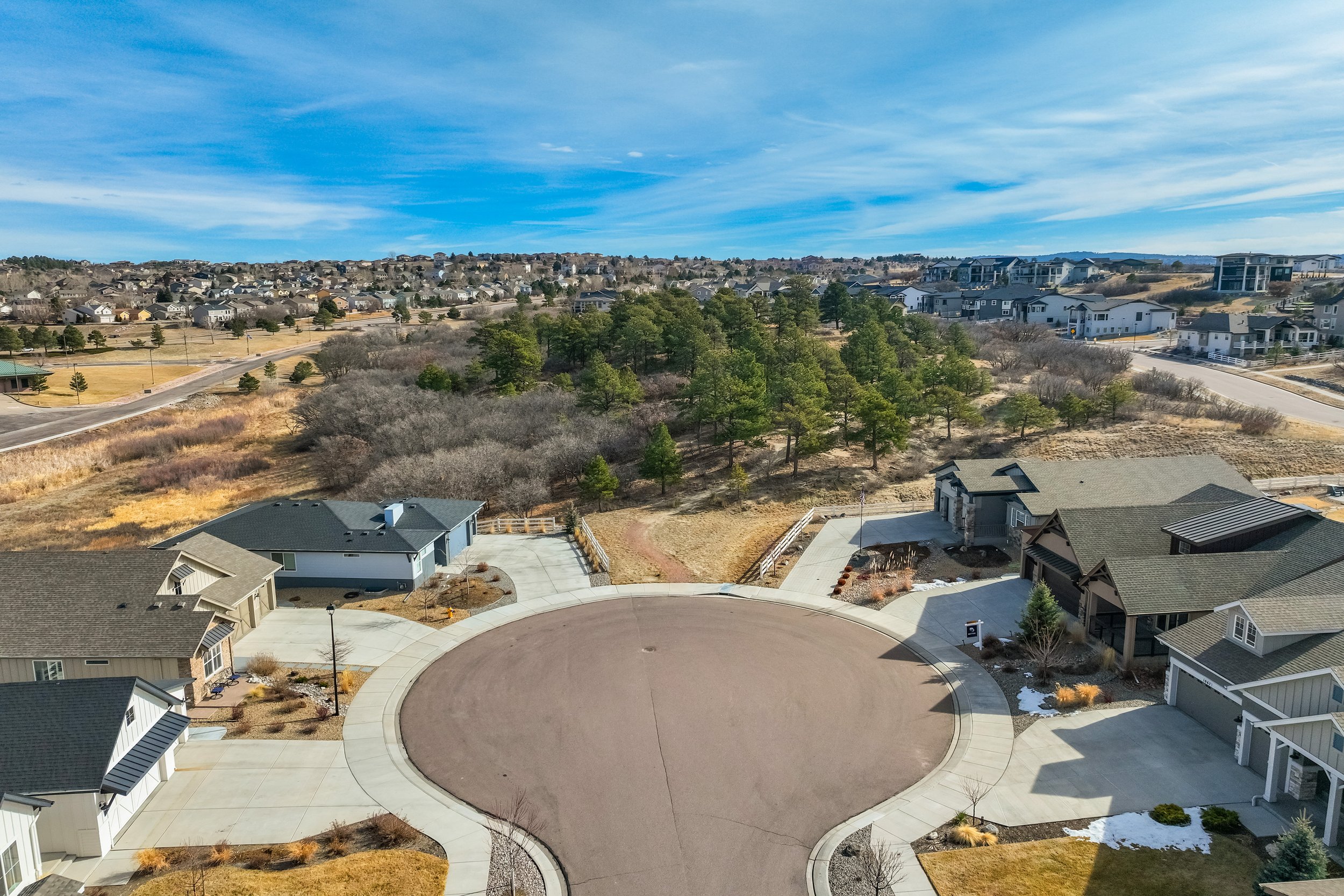 Commanding a .29-acre executive lot, this customized ranch floorplan by Saddletree Homes captures panoramic Pikes Peak and Front Range views—an architectural statement set against Colorado’s iconic backdrop. Soaring 10–13’ ceilings, 8’ doors, alder beams, electronic blinds + hardwood floors on the main, upgraded windows, lightly hand-troweled walls + dimmable lighting establish craftsmanship throughout. A floor-to-ceiling stone fireplace anchors the great room, while a dramatic Western Wall stacked slider creates seamless transition to outdoor living framed by mountain horizon. The kitchen balances design + performance w/10’ quartzite island, honed quartzite countertops, two-toned soft-close cabinetry, stainless steel appliances including gas range w/pot filler, under-cabinet lighting + walk-in pantry. A 2nd main-lvl bedroom + bath offer guest/multi-gen flexibility. The owner’s suite features integrated speakers, heated tile floors, mud-set shower w/linear drain, dual heads + quartz bench, quartz vanities w/counter-to-ceiling backsplash, freestanding tub + expansive walk-in closet opening directly to laundry rm. The walk-out bsmt is designed for entertaining w/9’ ceilings, surround sound, wet bar w/substantial granite edge, beverage refrigerator, ice maker, temperature-controlled wine cellar, Jr Suite w/walk-in closet + private bath, dedicated office w/French doors + modern fireplace, 4th bed/bath + unfinished storage. Outdoor living rivals w/bocce court, built-in kitchen w/dual-fuel pizza oven, black granite water feature, modern pavers w/gas fire pit, expansive concrete covered deck + sun deck w/speakers + gas line. Oversized finished 3-car garage pre-wired for EV charger. Located in the sought-after Farm community w/District 20 schools, The Gathering Place Rec Center, trails + open space + convenient access to shopping, dining + I-25. Constructed for high-performance efficiency, this residence delivers elevated design + lifestyle distinction without compromise.