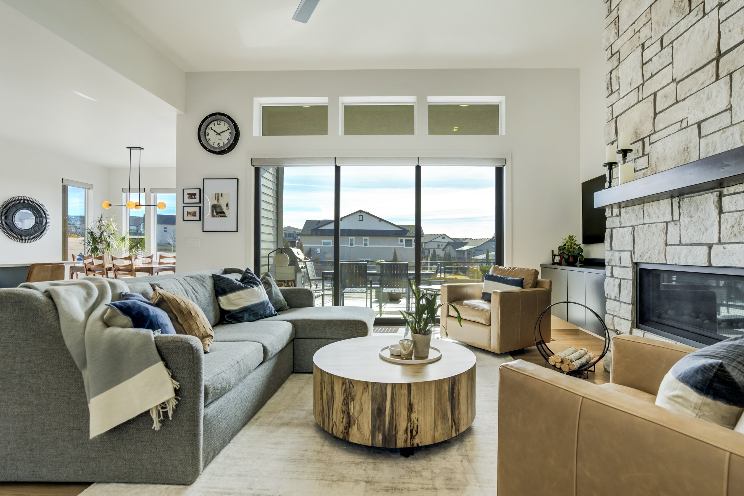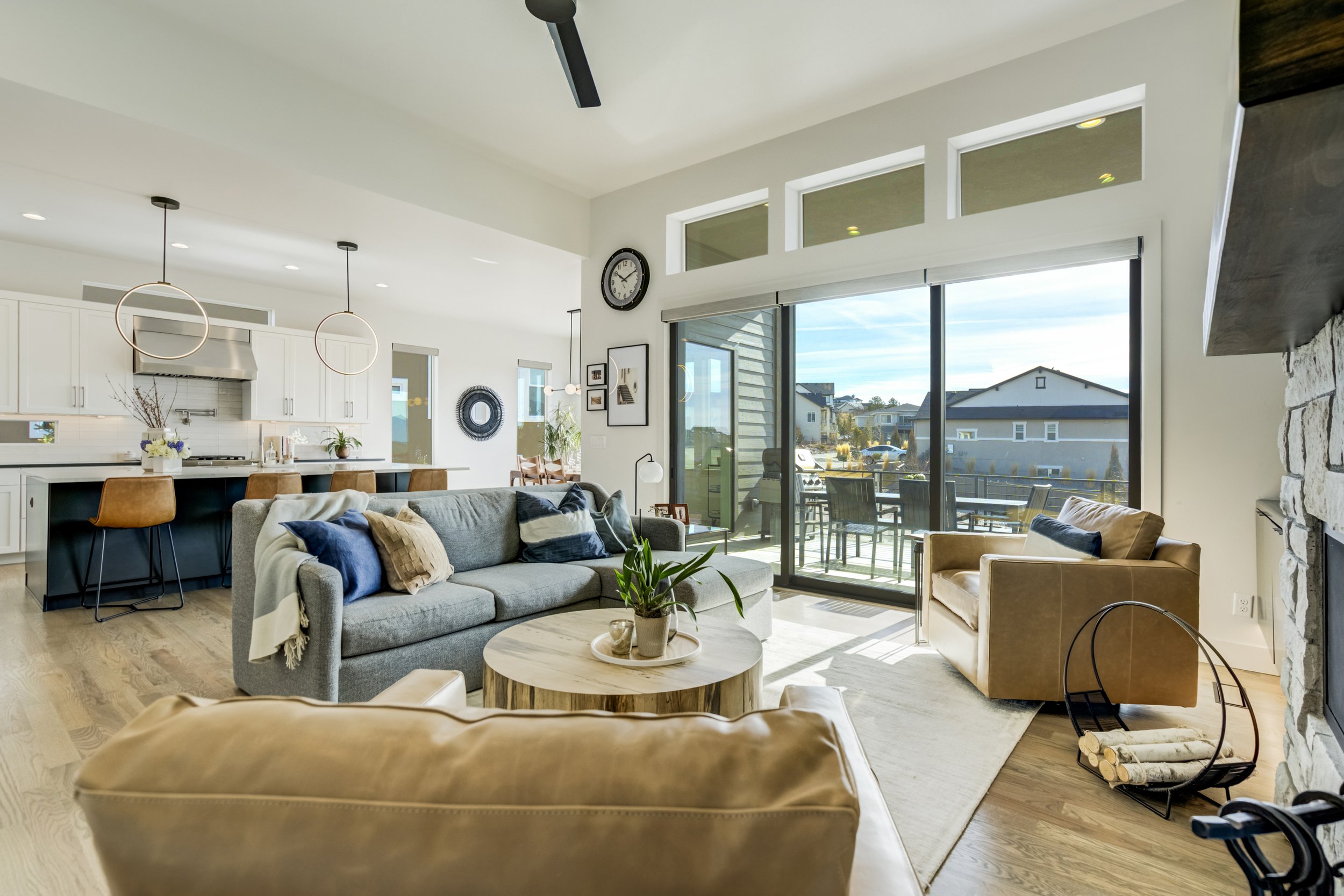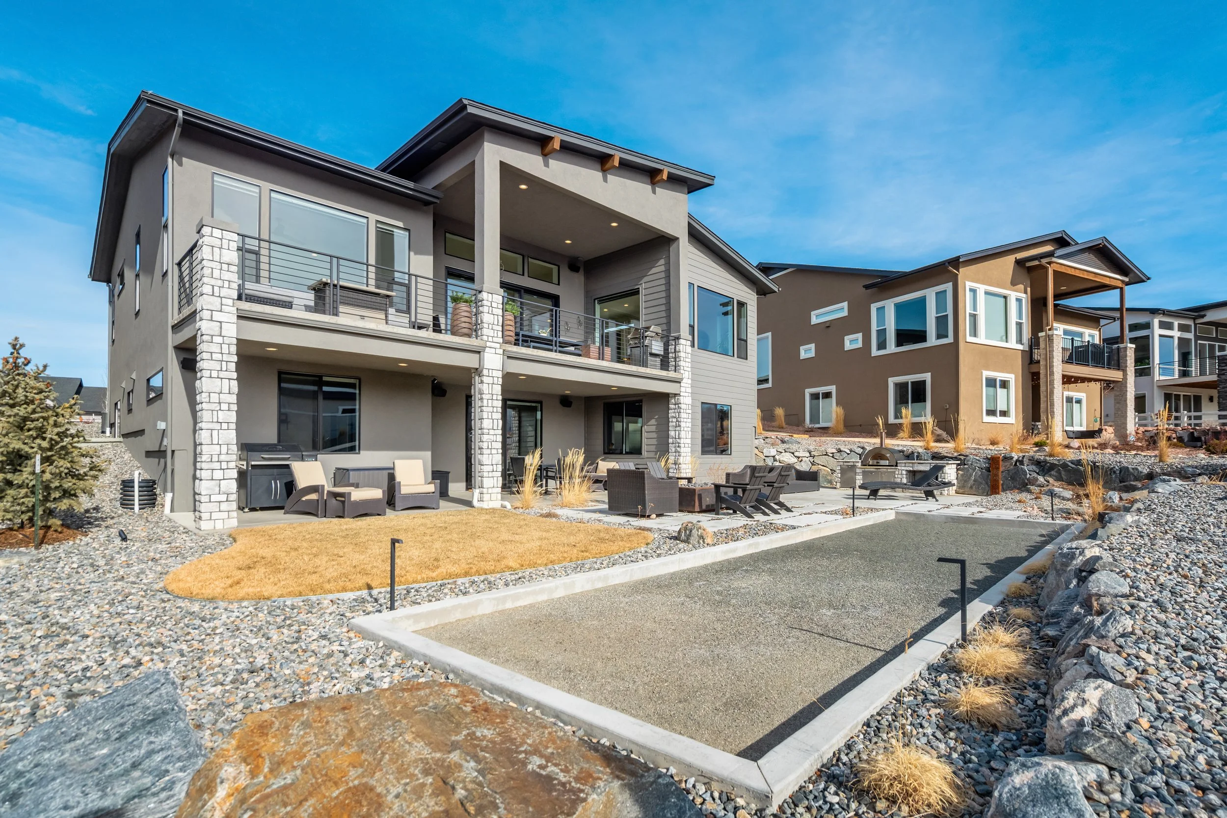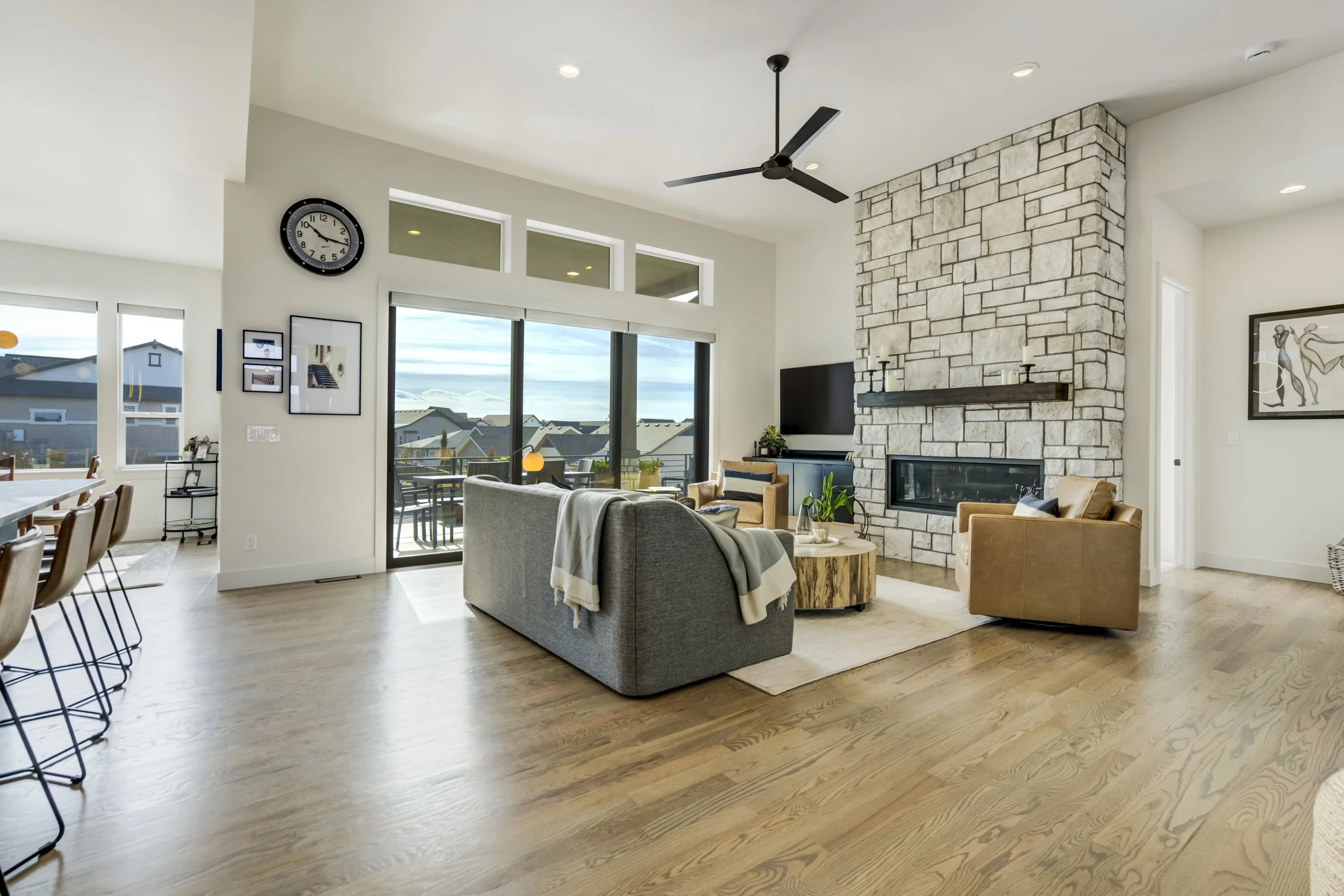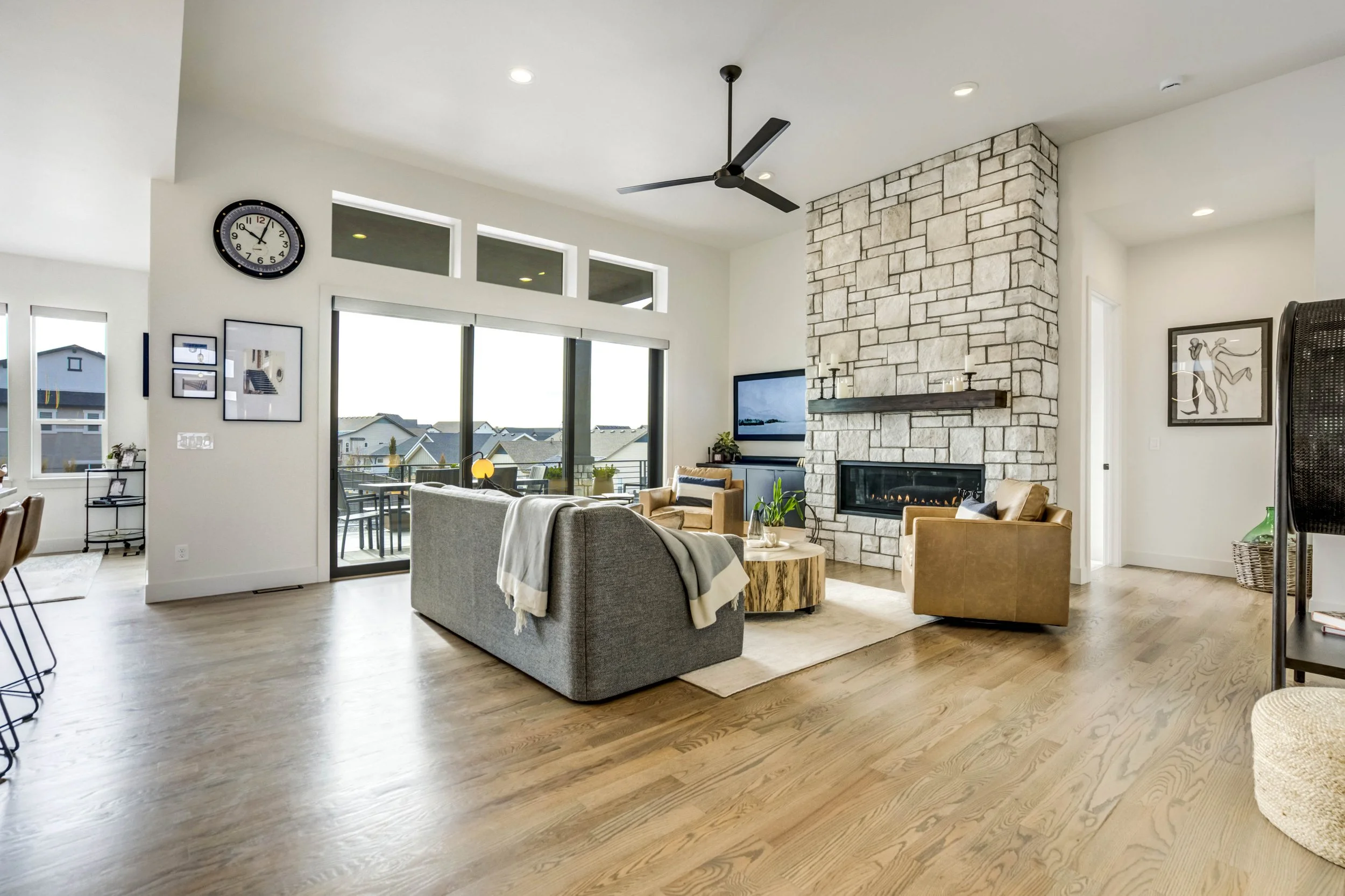 Commanding a .29-acre executive lot, this customized ranch floorplan by Saddletree Homes captures panoramic Pikes Peak and Front Range views—an architectural statement set against Colorado’s iconic backdrop. Soaring 10–13’ ceilings, 8’ doors, alder beams, electronic blinds + hardwood floors on the main, upgraded windows, lightly hand-troweled walls + dimmable lighting establish craftsmanship throughout. A floor-to-ceiling stone fireplace anchors the great room, while a dramatic Western Wall stacked slider creates seamless transition to outdoor living framed by mountain horizon. The kitchen balances design + performance w/10’ quartzite island, honed quartzite countertops, two-toned soft-close cabinetry, stainless steel appliances including gas range w/pot filler, under-cabinet lighting + walk-in pantry. A 2nd main-lvl bedroom + bath offer guest/multi-gen flexibility. The owner’s suite features integrated speakers, heated tile floors, mud-set shower w/linear drain, dual heads + quartz bench, quartz vanities w/counter-to-ceiling backsplash, freestanding tub + expansive walk-in closet opening directly to laundry rm. The walk-out bsmt is designed for entertaining w/9’ ceilings, surround sound, wet bar w/substantial granite edge, beverage refrigerator, ice maker, temperature-controlled wine cellar, Jr Suite w/walk-in closet + private bath, dedicated office w/French doors + modern fireplace, 4th bed/bath + unfinished storage. Outdoor living rivals w/bocce court, built-in kitchen w/dual-fuel pizza oven, black granite water feature, modern pavers w/gas fire pit, expansive concrete covered deck + sun deck w/speakers + gas line. Oversized finished 3-car garage pre-wired for EV charger. Located in the sought-after Farm community w/District 20 schools, The Gathering Place Rec Center, trails + open space + convenient access to shopping, dining + I-25. Constructed for high-performance efficiency, this residence delivers elevated design + lifestyle distinction without compromise.
