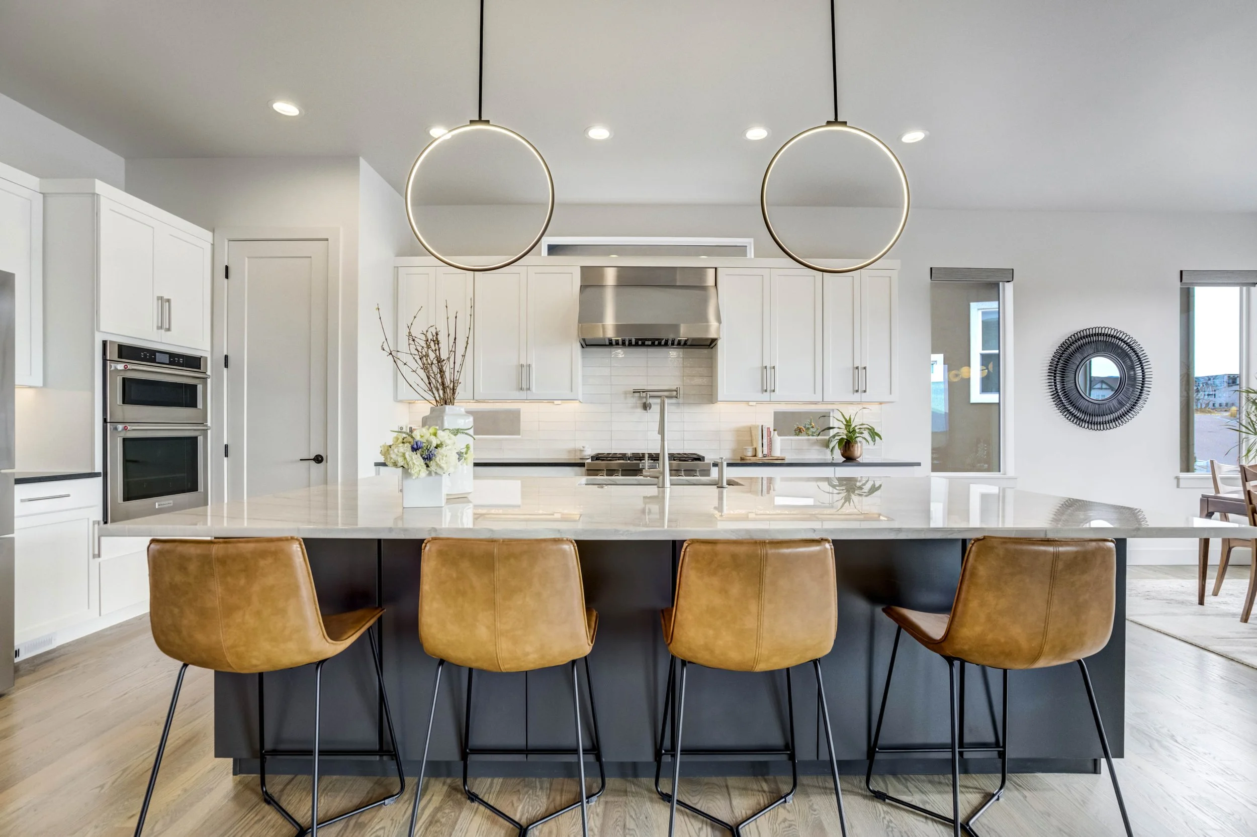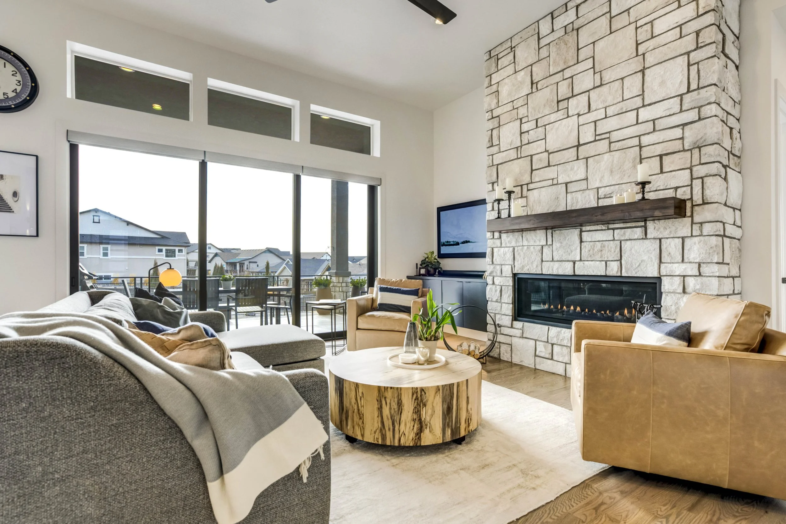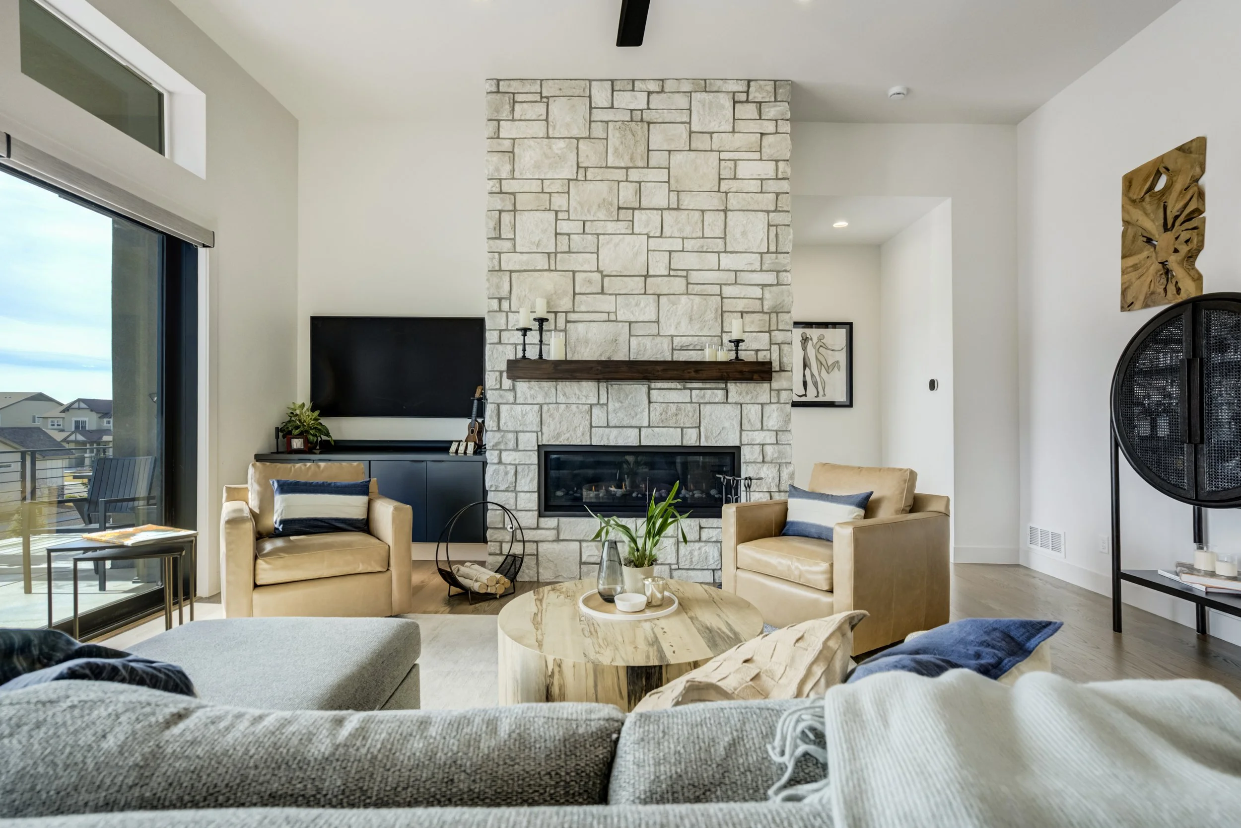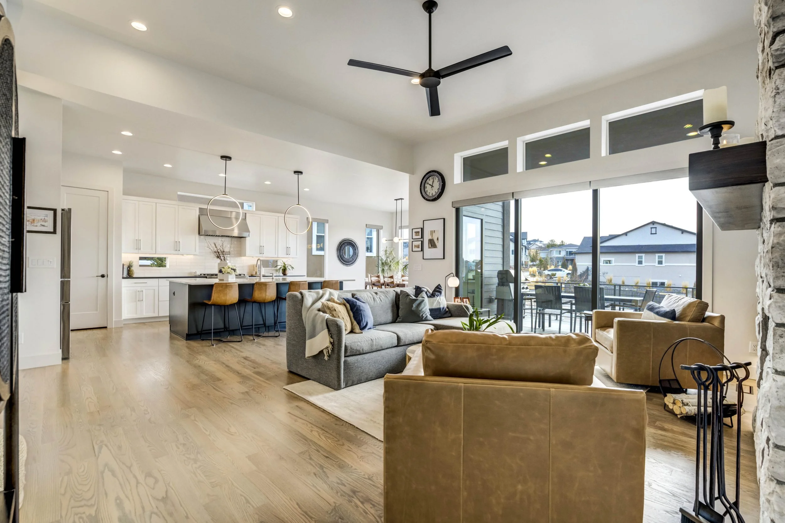Commanding a .29-acre executive lot, this customized ranch floorplan by Saddletree Homes captures panoramic Pikes Peak and Front Range views—an architectural statement set against Colorado’s iconic backdrop. Soaring 10–13’ ceilings, 8’ doors, alder beams, electronic blinds + hardwood floors on the main, upgraded windows, lightly hand-troweled walls + dimmable lighting establish craftsmanship throughout. A floor-to-ceiling stone fireplace anchors the great room, while a dramatic Western Wall stacked slider creates seamless transition to outdoor living framed by mountain horizon. The kitchen balances design + performance w/10’ quartzite island, honed quartzite countertops, two-toned soft-close cabinetry, stainless steel appliances including gas range w/pot filler, under-cabinet lighting + walk-in pantry. A 2nd main-lvl bedroom + bath offer guest/multi-gen flexibility. The owner’s suite features integrated speakers, heated tile floors, mud-set shower w/linear drain, dual heads + quartz bench, quartz vanities w/counter-to-ceiling backsplash, freestanding tub + expansive walk-in closet opening directly to laundry rm. The walk-out bsmt is designed for entertaining w/9’ ceilings, surround sound, wet bar w/substantial granite edge, beverage refrigerator, ice maker, temperature-controlled wine cellar, Jr Suite w/walk-in closet + private bath, dedicated office w/French doors + modern fireplace, 4th bed/bath + unfinished storage. Outdoor living rivals w/bocce court, built-in kitchen w/dual-fuel pizza oven, black granite water feature, modern pavers w/gas fire pit, expansive concrete covered deck + sun deck w/speakers + gas line. Oversized finished 3-car garage pre-wired for EV charger. Located in the sought-after Farm community w/District 20 schools, The Gathering Place Rec Center, trails + open space + convenient access to shopping, dining + I-25. Constructed for high-performance efficiency, this residence delivers elevated design + lifestyle distinction without compromise.